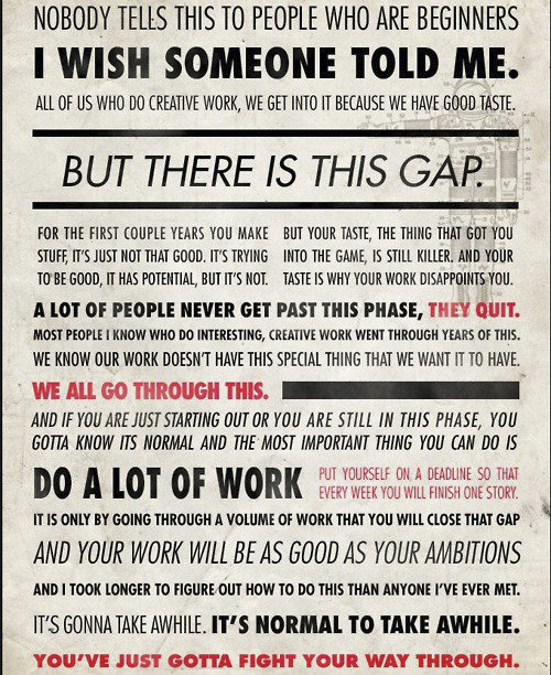 Originally from here. I’m taking a lot of comfort from this. I feel like my work is at a crossroads–I’m not as good as I want to be, and I’ve reached a sort of plateau. I can either keep writing and hope to push through, or give up. My writing is just Okay. Occasionally I churn out something that’s Good but never Spectacular. The trouble is, there’s no road map for getting from Okay to Spectacular. All you can do is keep working, and growing, and trying to improve. Easier said than done–improvement is such a nebulous thing. But hopefully I’ll get there. Just have to “keep plugging,” as my Dad says.
